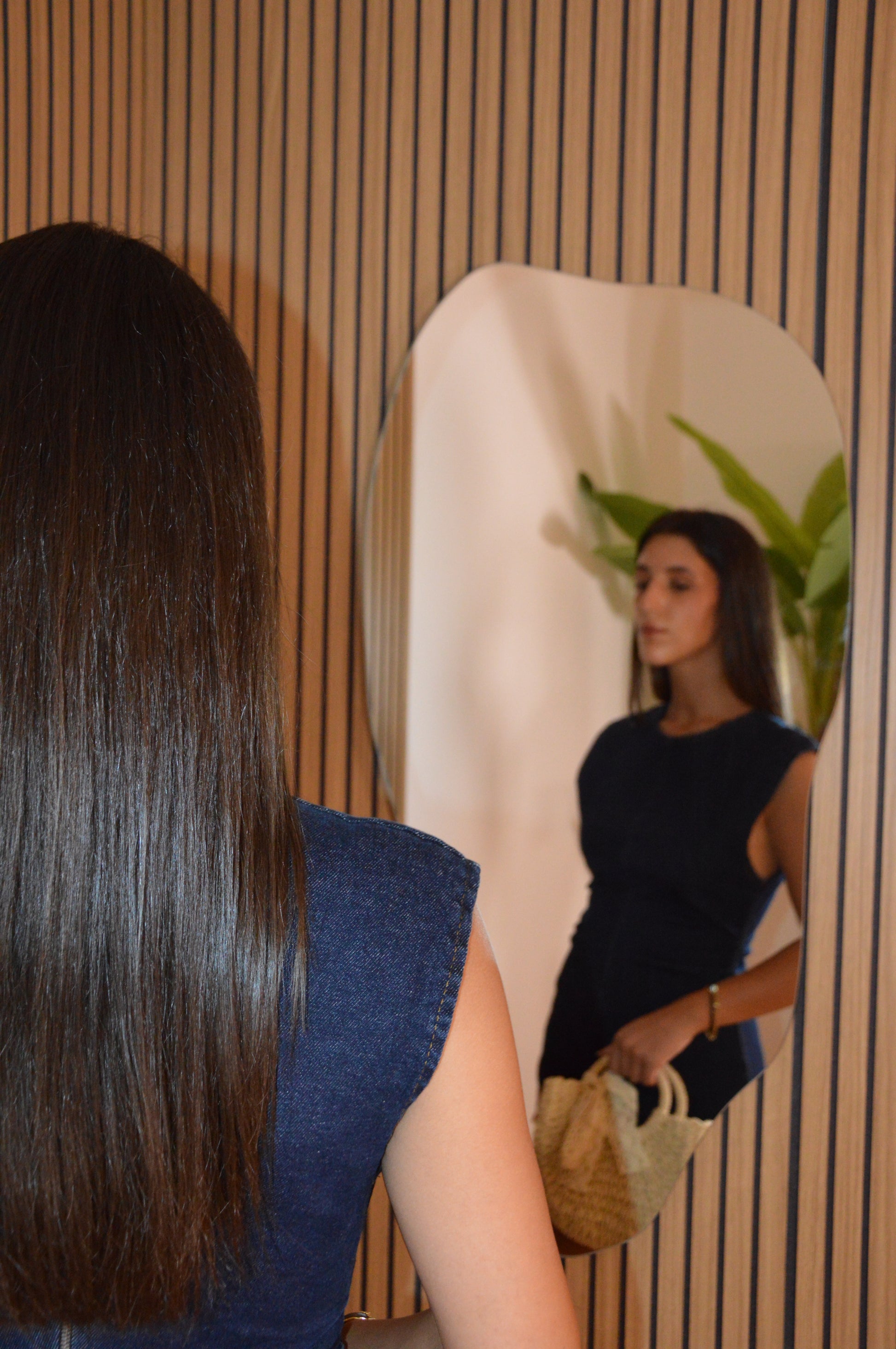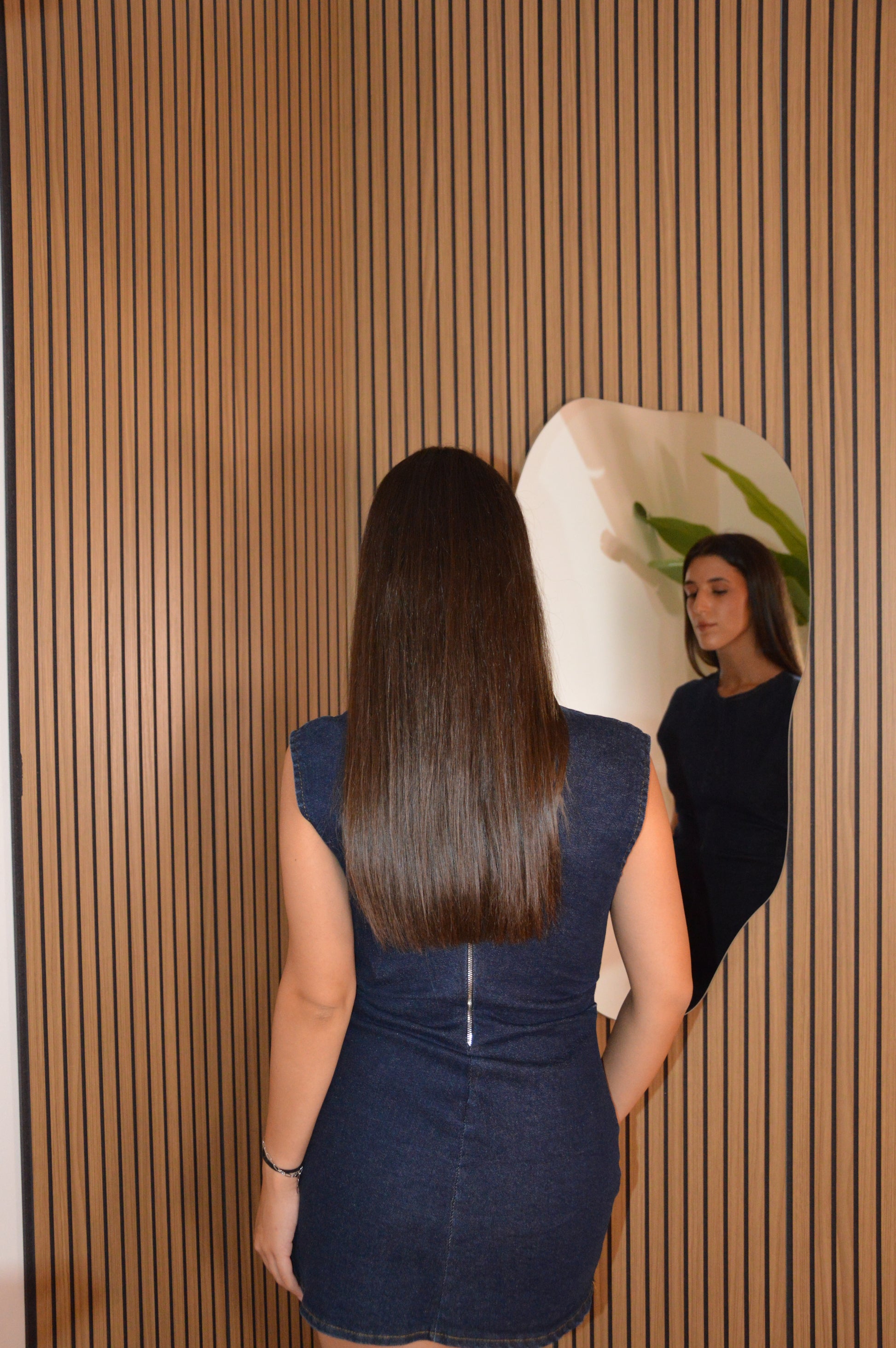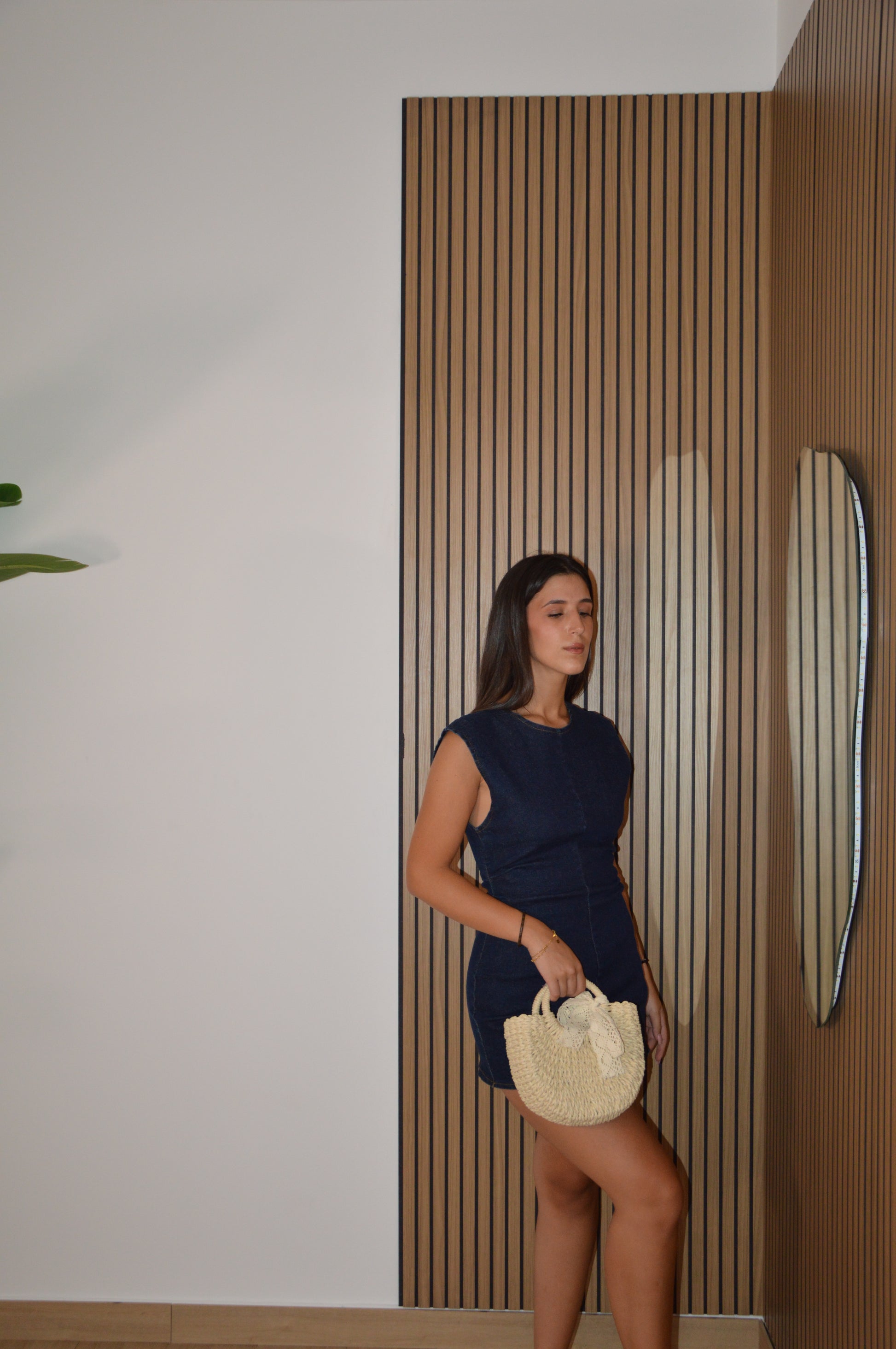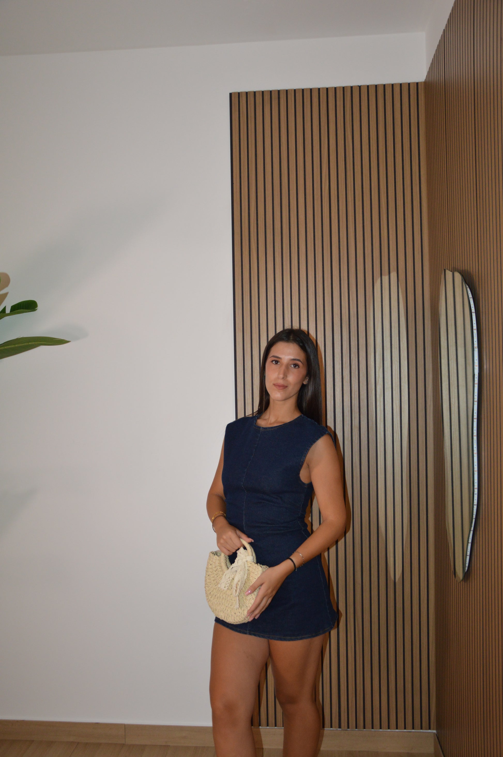 Abito corto in denim con arricciatura sui fianchi, cerniera sul retro argentata