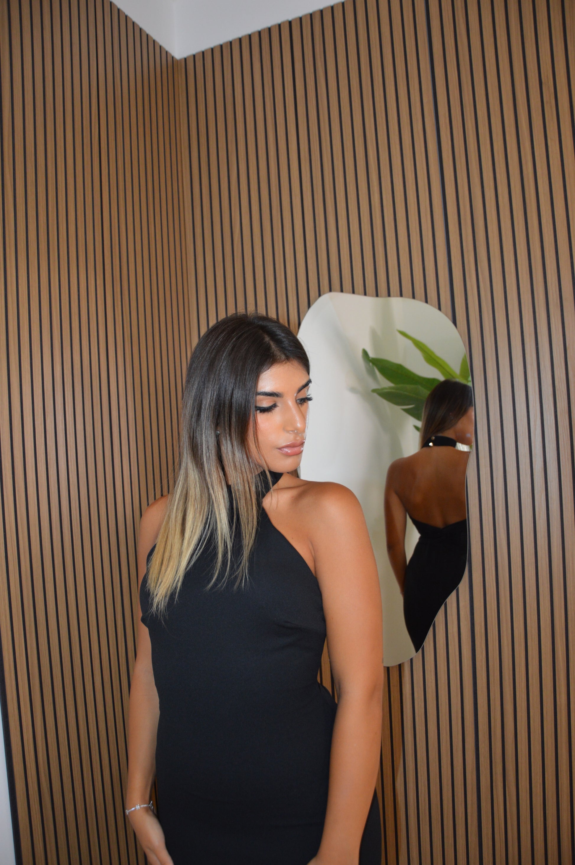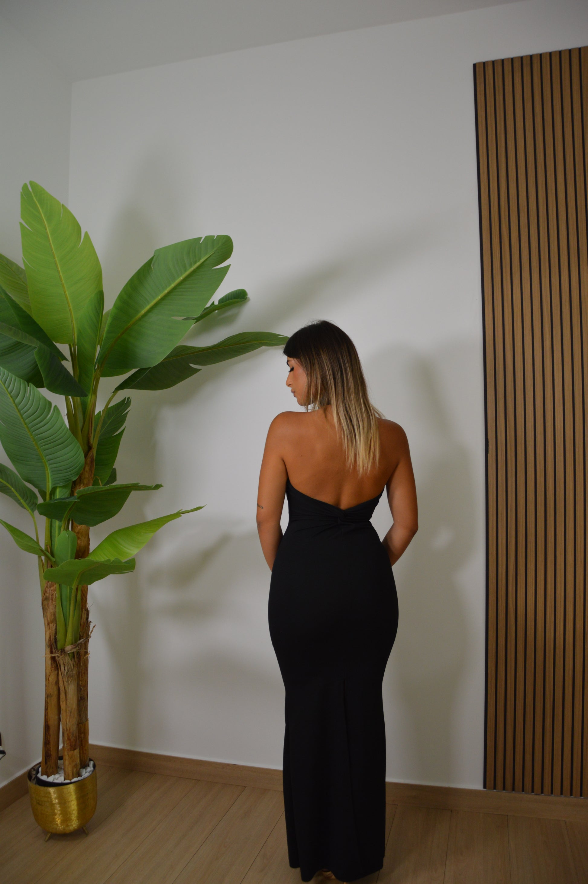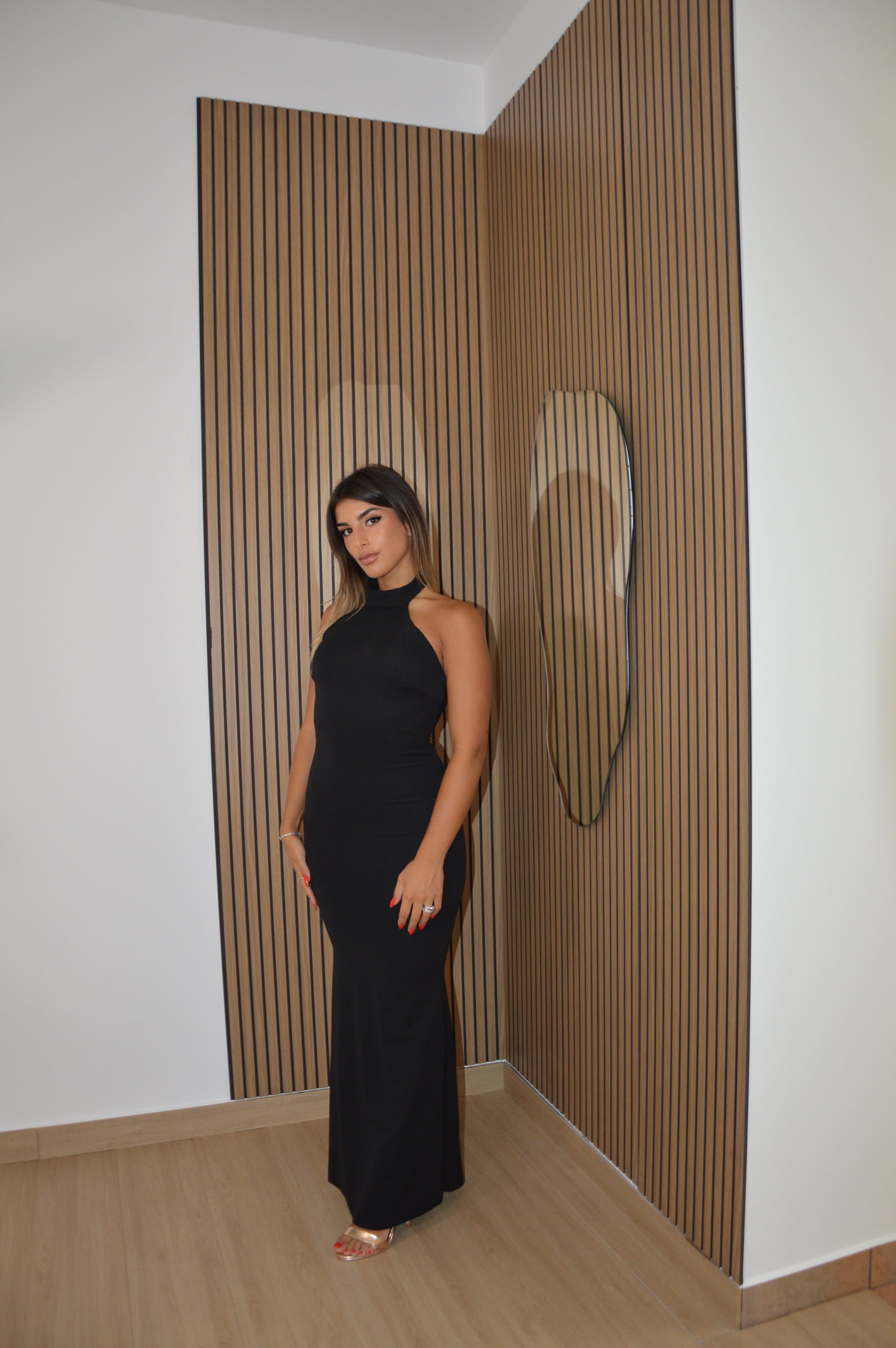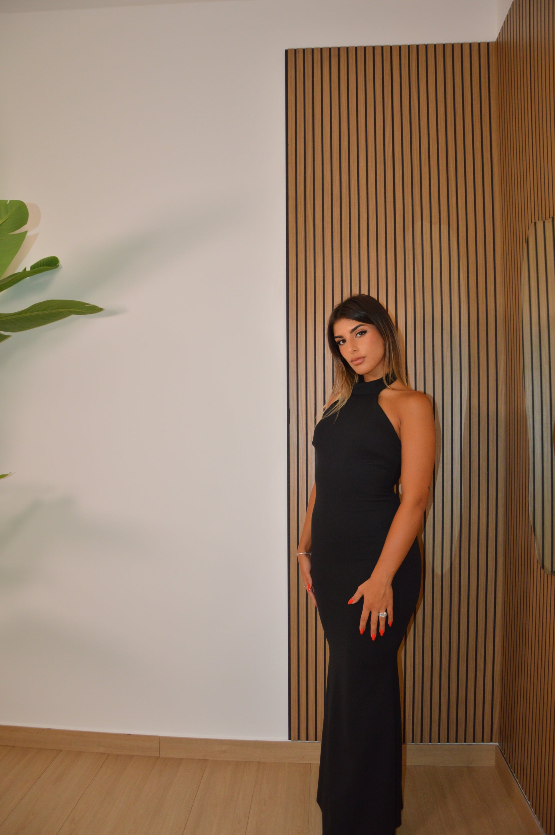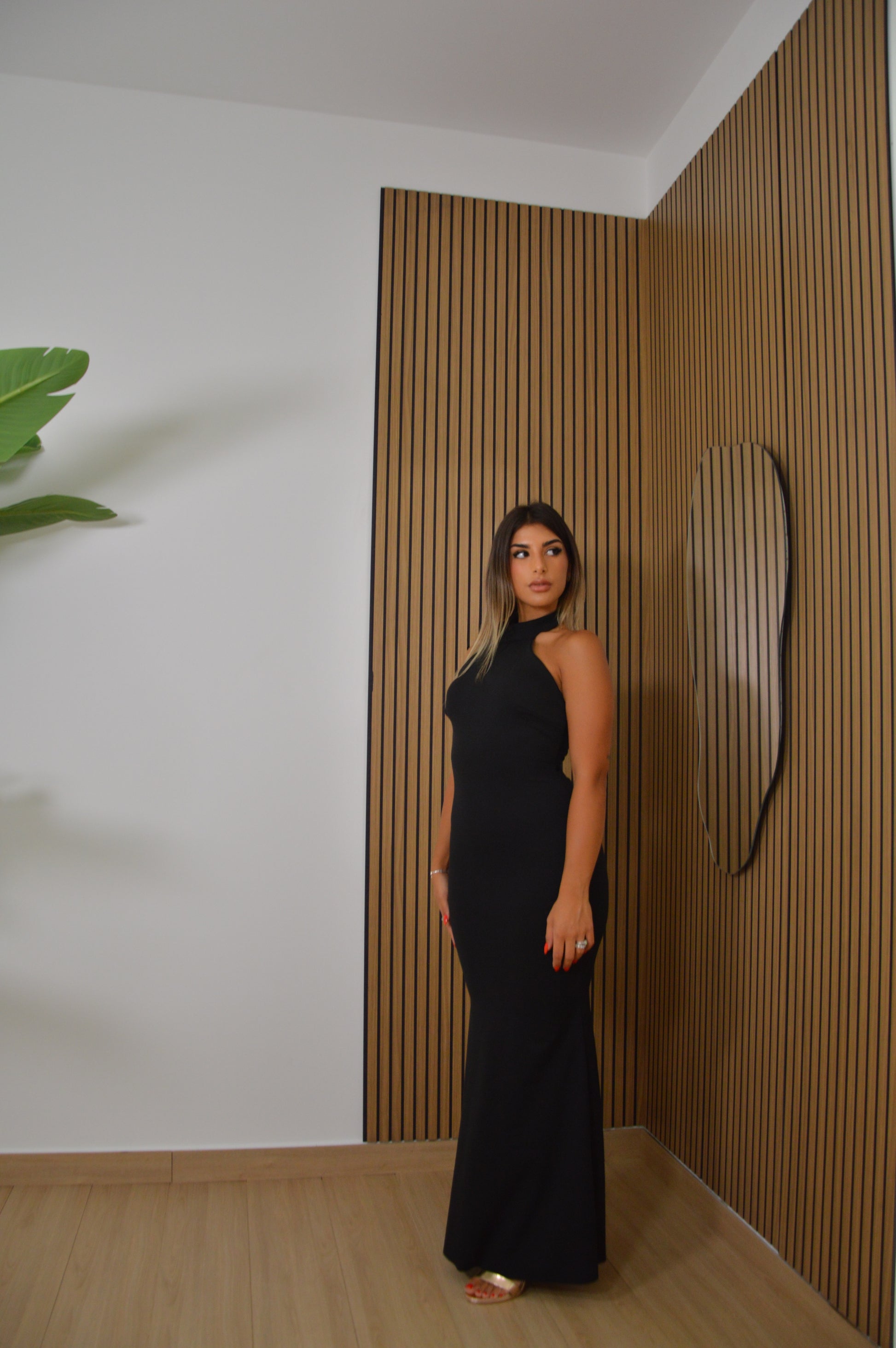 Abito lungo, schiena schiena scoperta con nodo, chiusura sul retro con bottoni oro
