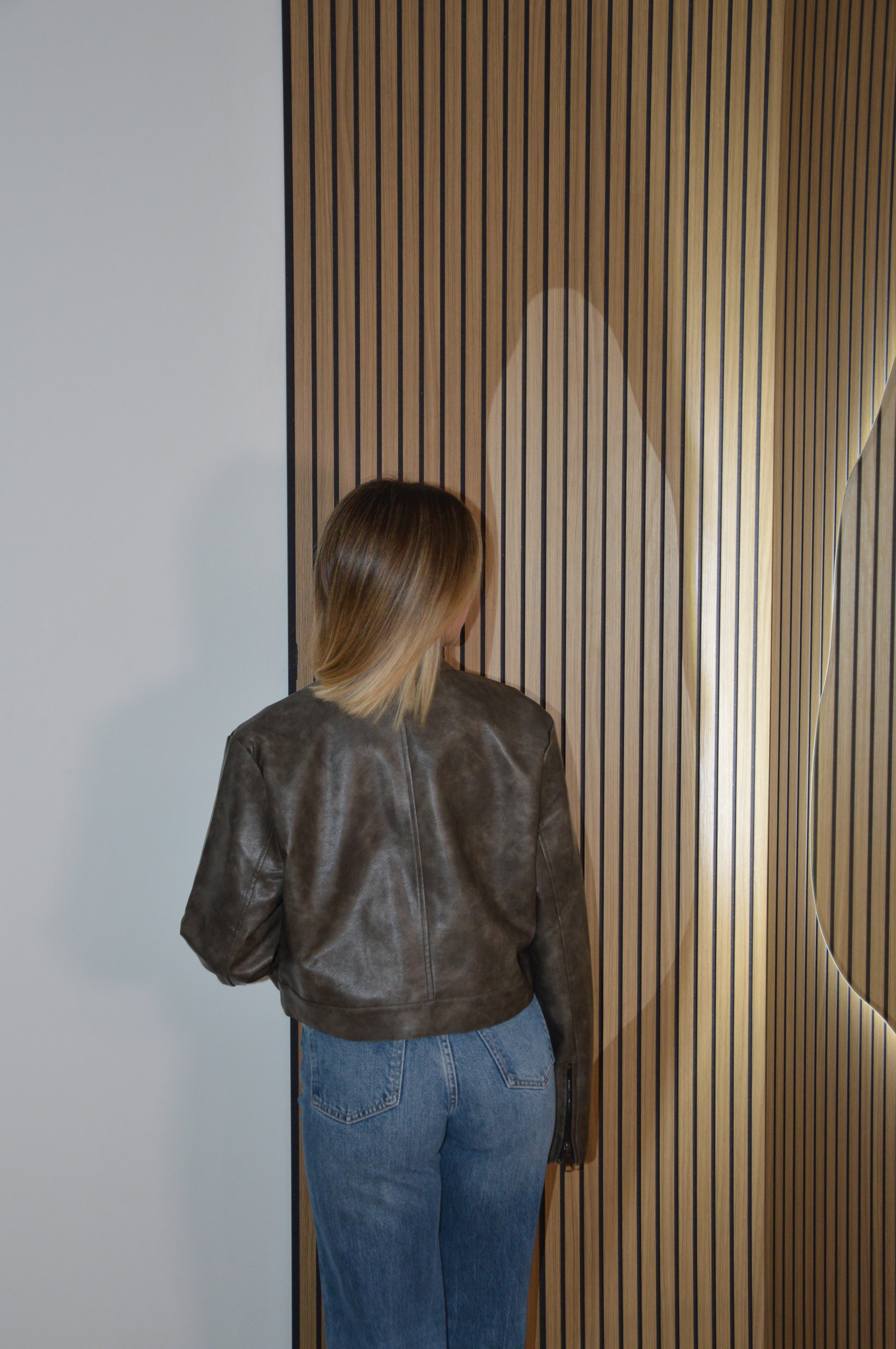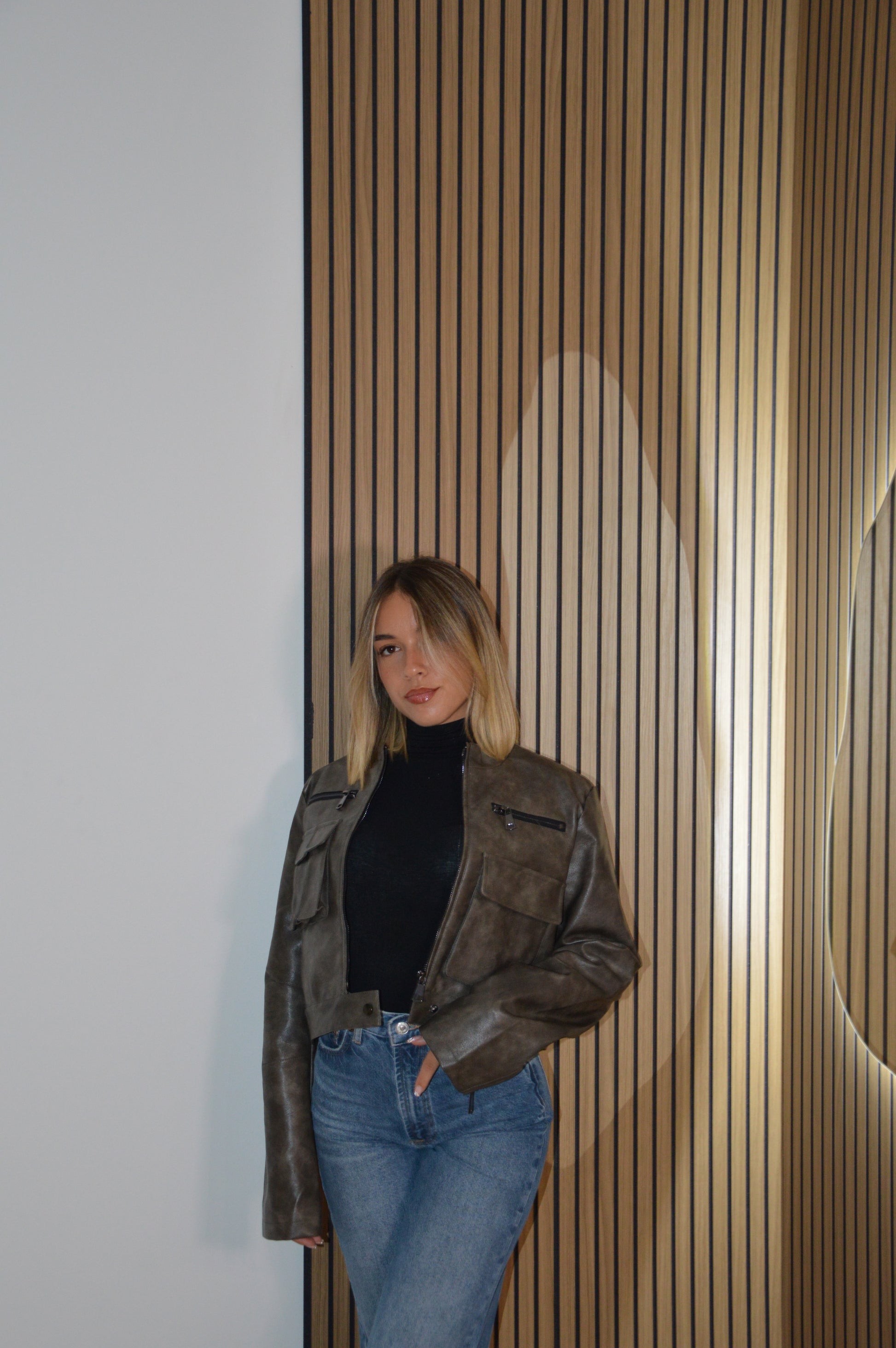 Giacca di pelle corta, copn tasche e cerniere