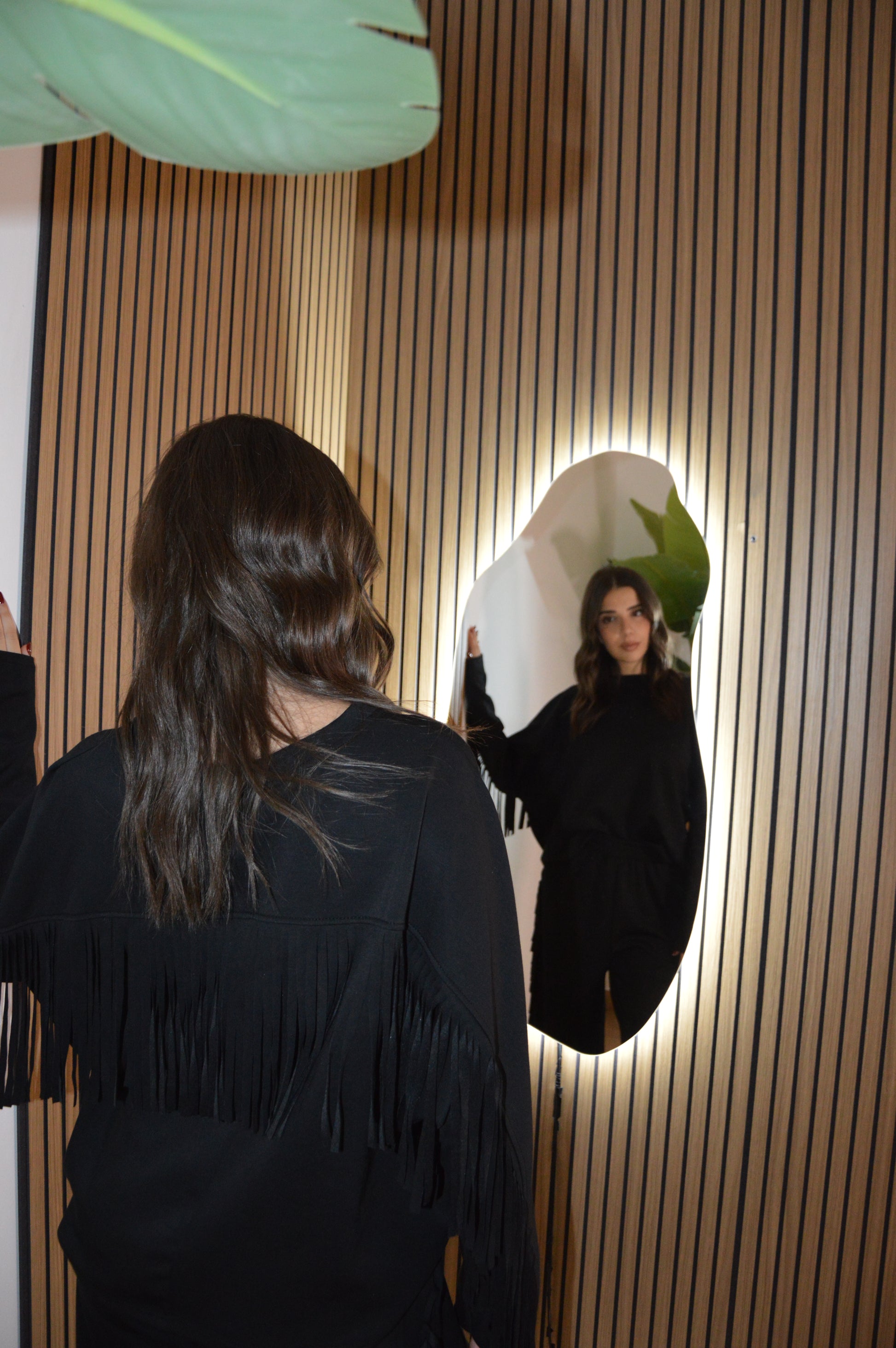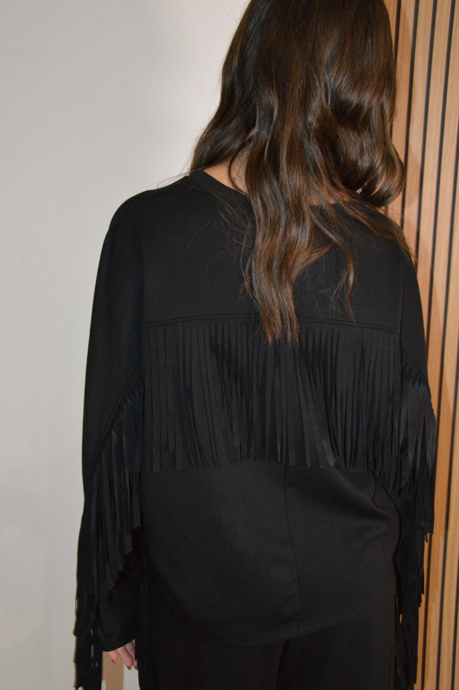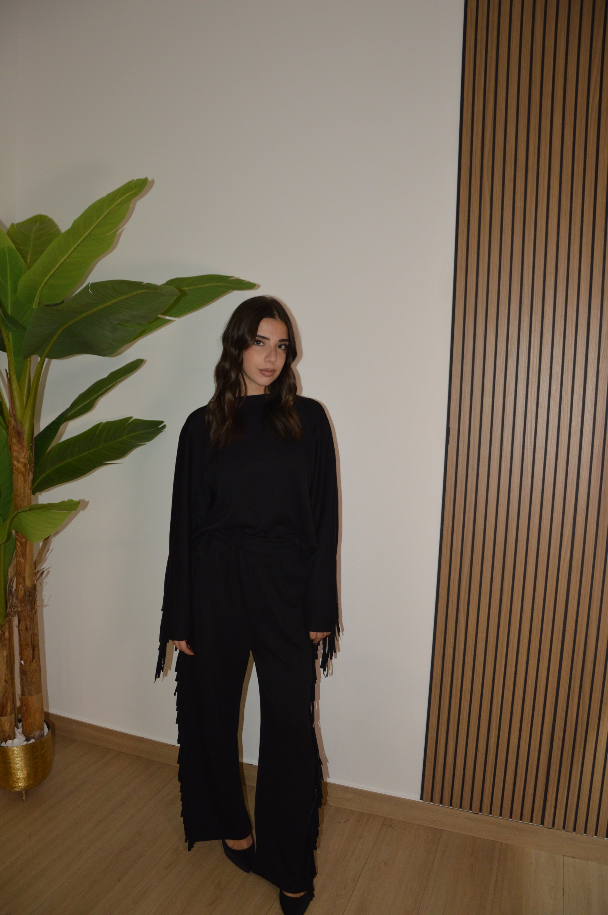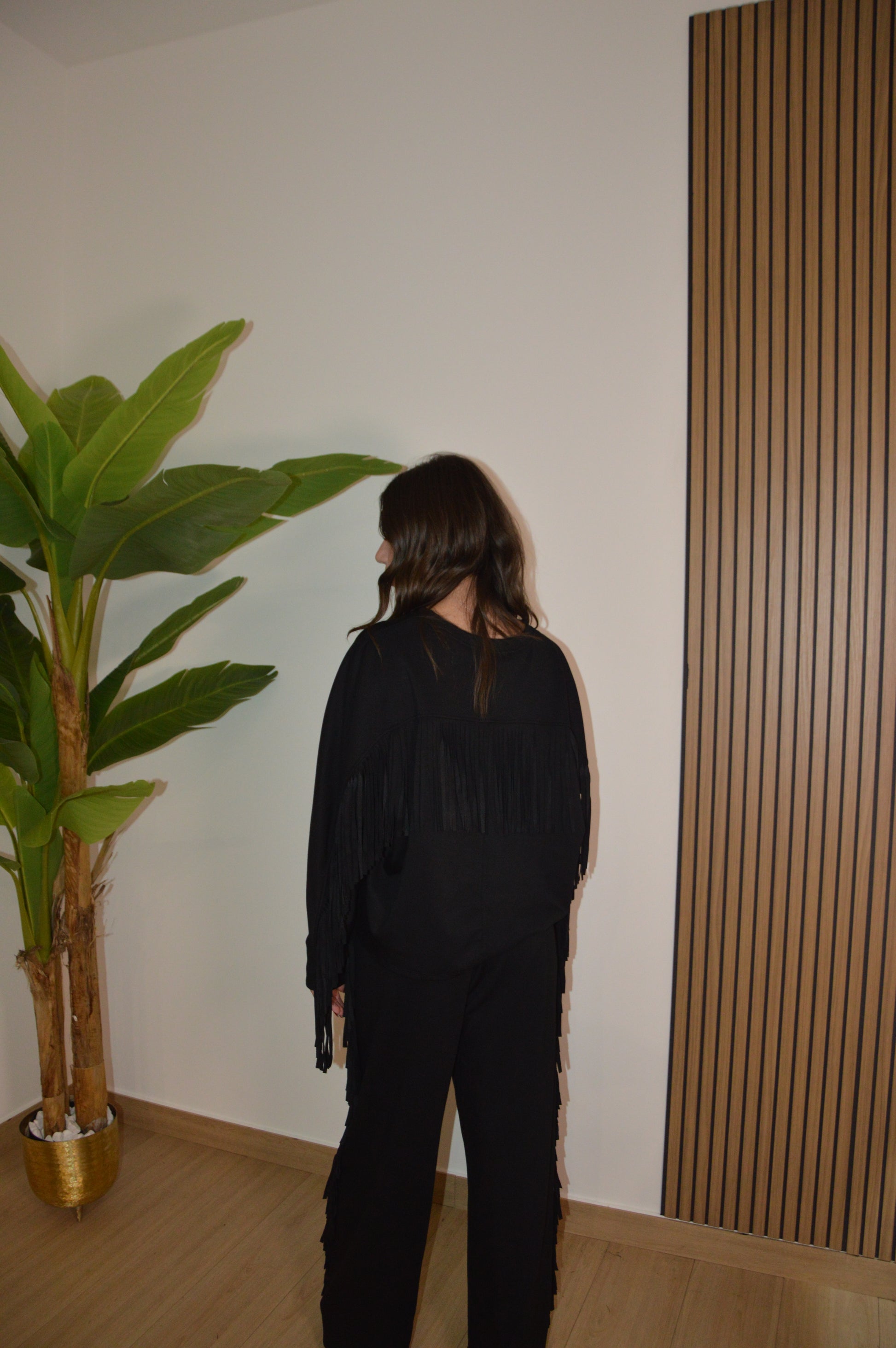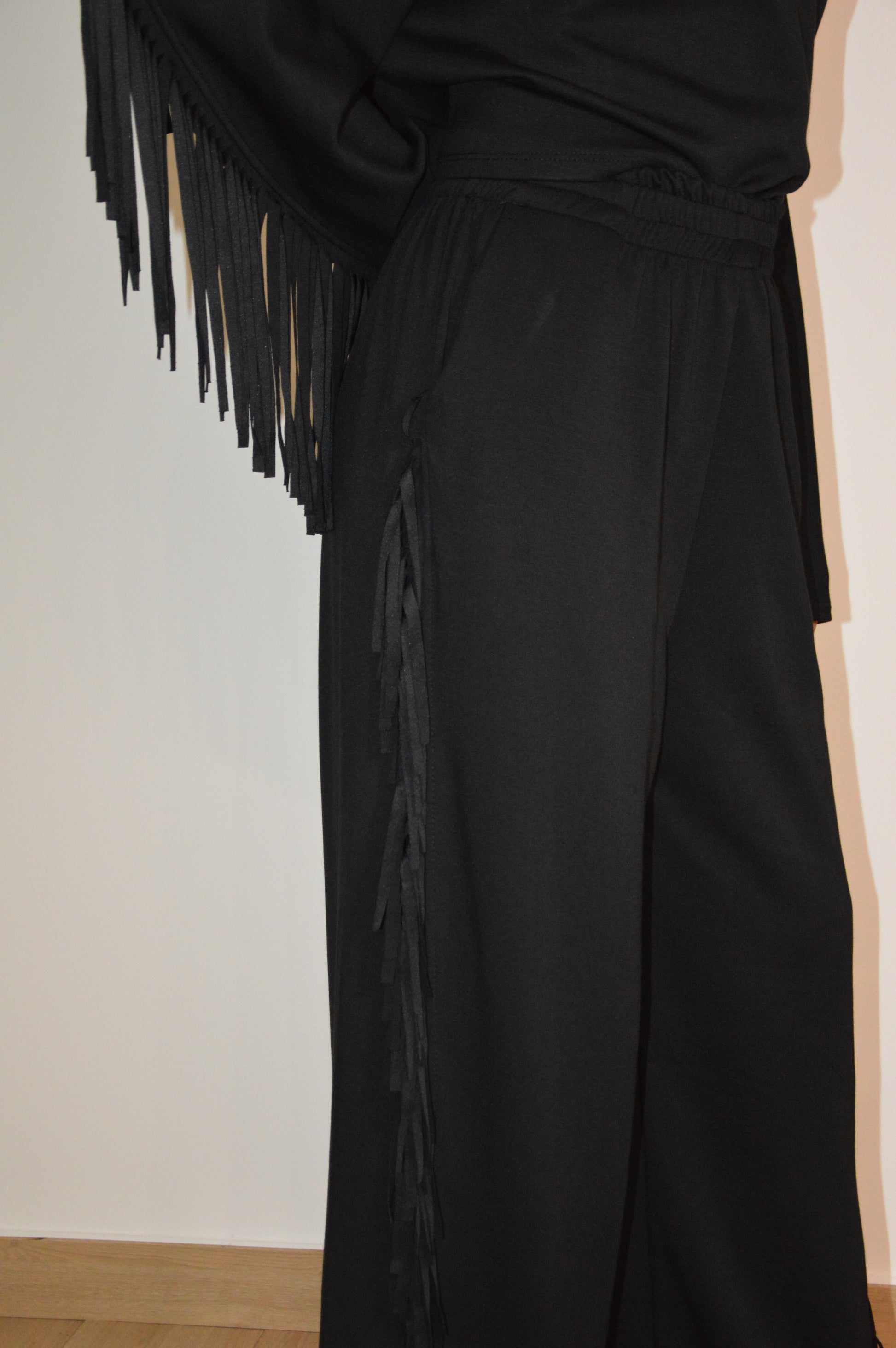 Completo di tuta composta da felpa con frange sul retro, pantaloni con frange sui laterali
